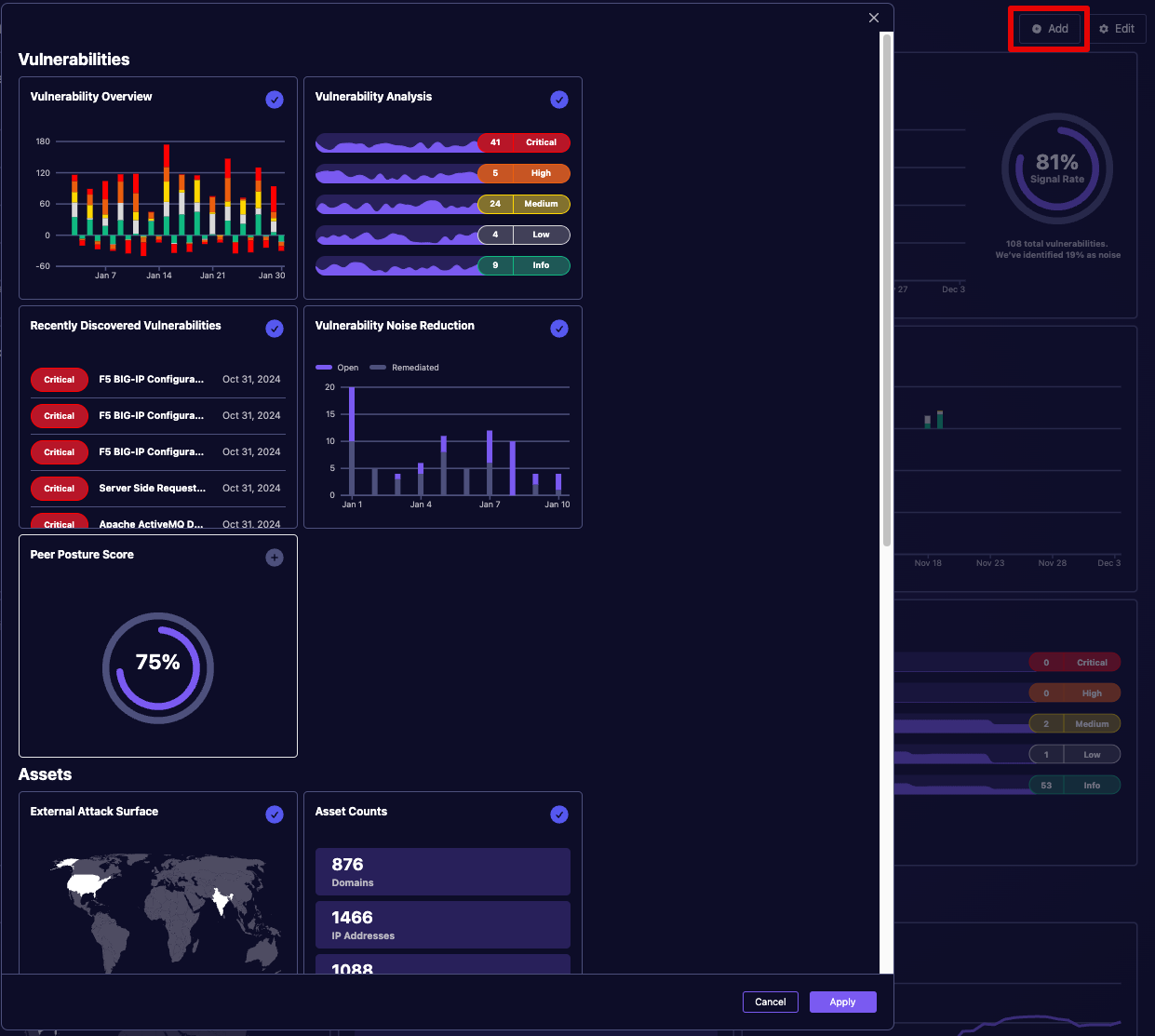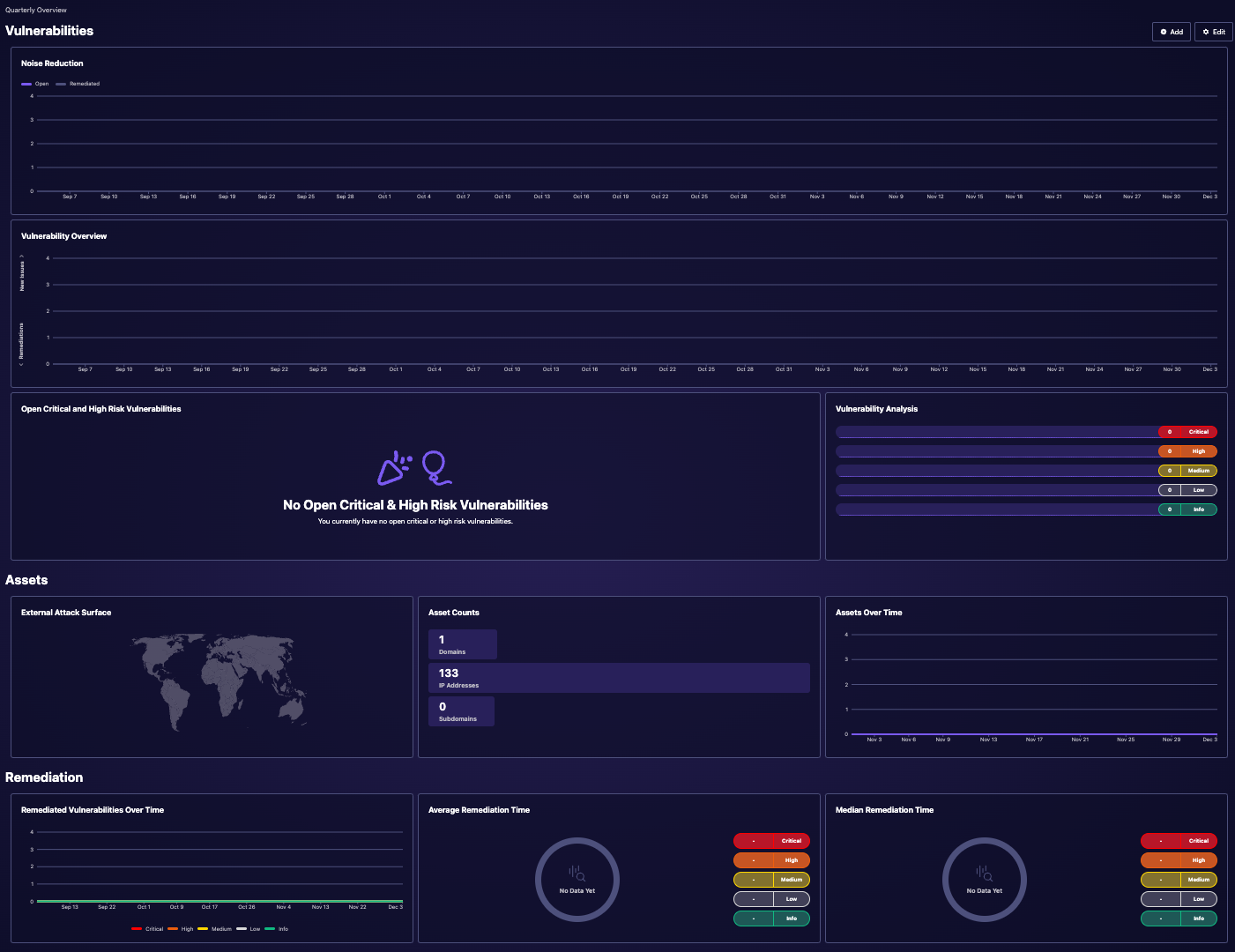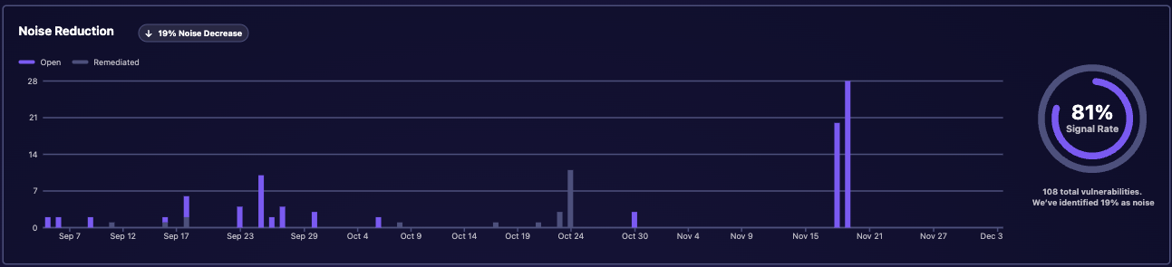 The Vulnerabilities section provides a comprehensive view of your security landscape through several key widgets. The Noise Reduction widget helps you distinguish between active threats and resolved issues by displaying both open and remediated vulnerabilities side by side.