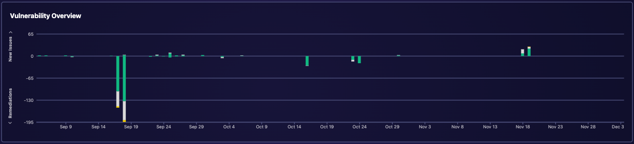 Complementing this, the Vulnerability Overview widget tracks the lifecycle of vulnerabilities, revealing patterns in how issues are discovered and resolved over time.