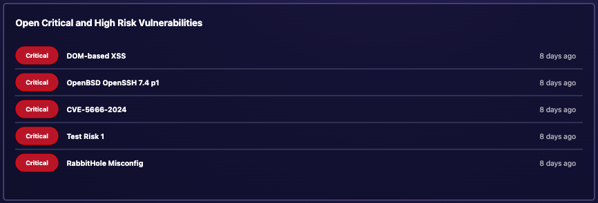 For immediate attention to critical issues, the Open Critical and High Risk Vulnerabilities widget presents a curated list of your most pressing security concerns.