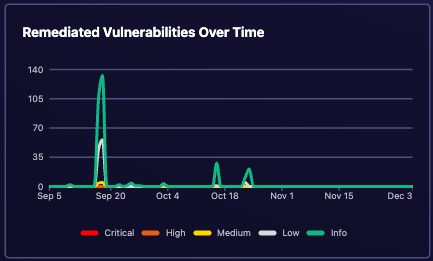 Effective remediation is key to maintaining strong security, and this section provides deep insights into your team's performance. The Remediated Vulnerabilities Over Time widget shows your progress in addressing security issues, with a detailed breakdown by severity level.